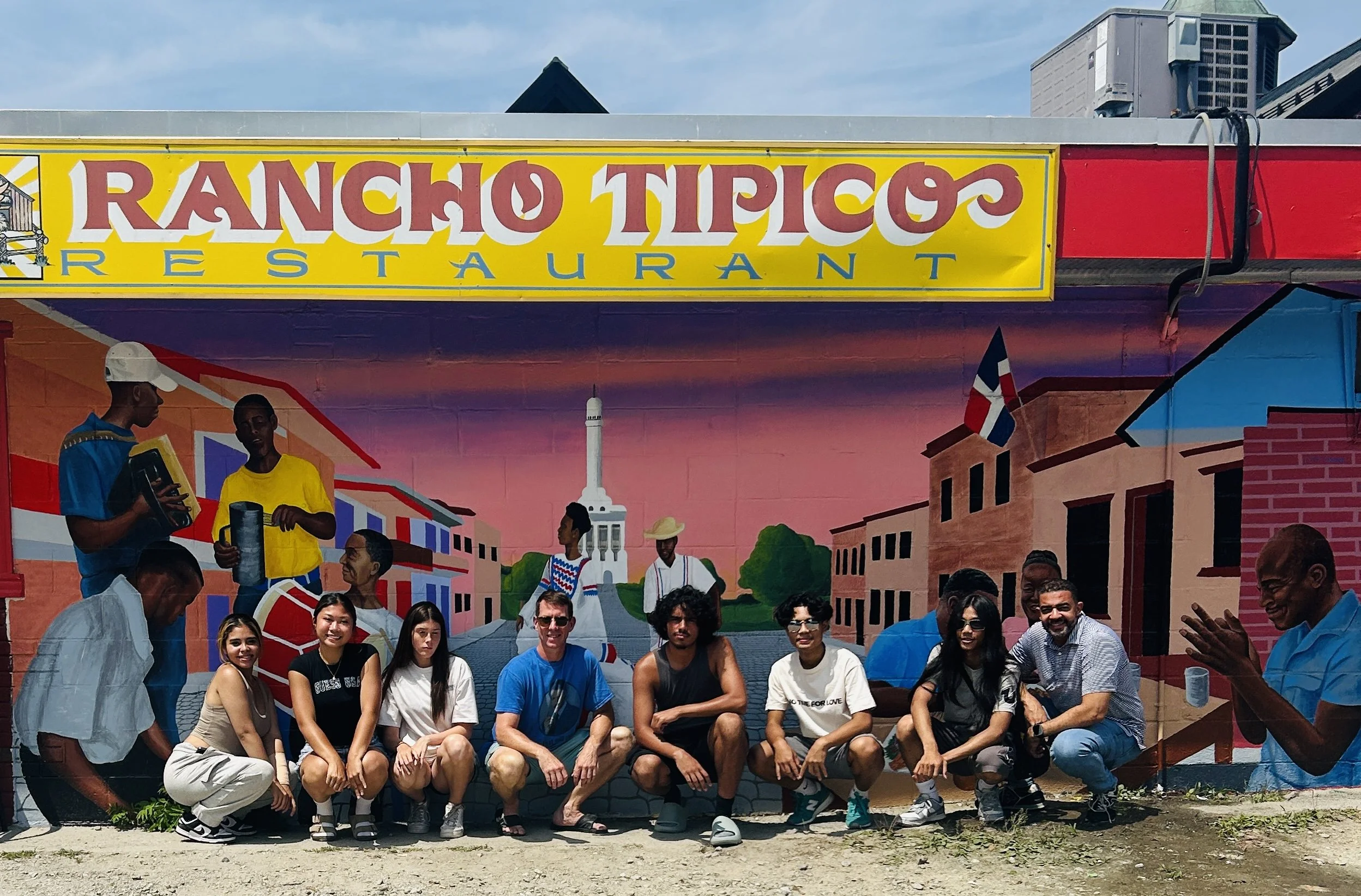 “This piece celebrates Dominican Culture in Lowell and is located on one the community's most delicious Dominican Restaurants, Rancho Tipico "We designed this mural to pay tribute to Dominican culture by including elements of their music, dance, family and food. We included the rooster as a symbol of the restaurant as seen in its logo. The Monument to Santiago can be seen in the background, shining in the evening sky. For me personally, the mural is a symbol of Dominican culture and people, and tries to capture the essence of the people who serve the food inside." -- Eric Allshouse